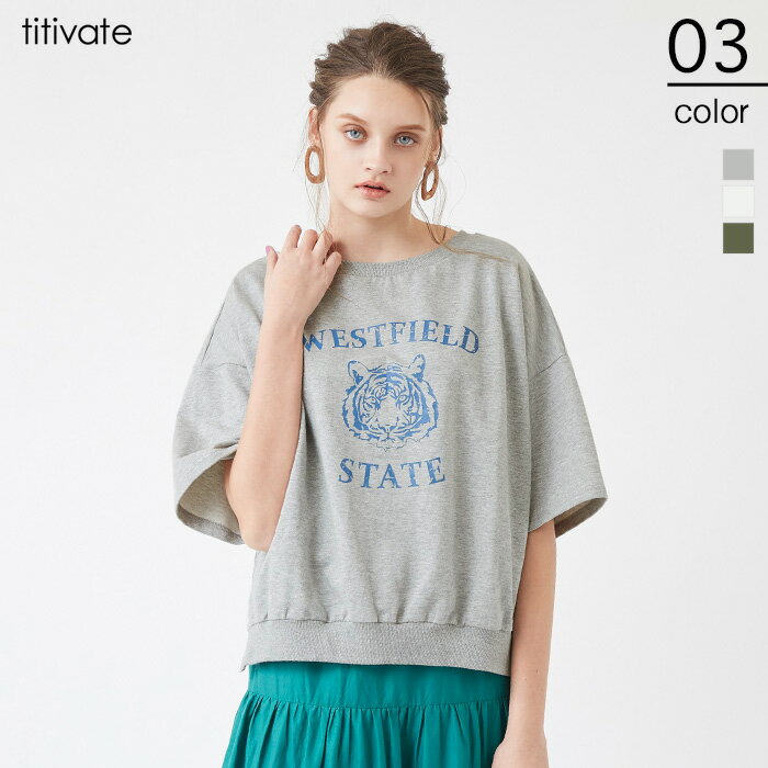 ロゴスウェットプルオーバー/かすれプリントがカジュアル感を演出/トップス/レディース/カットソー/スウェット/裏毛/オーバーサイズ/ラウンドネック/半袖/5分袖/モチーフプリント/トラ柄/アニマル柄/カジュアル【メール便可/90】